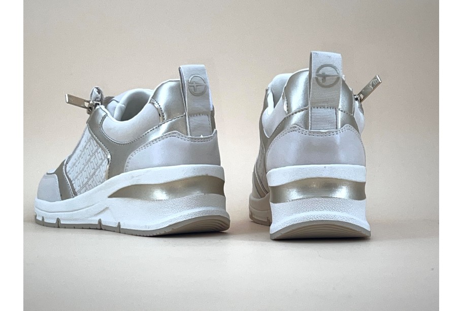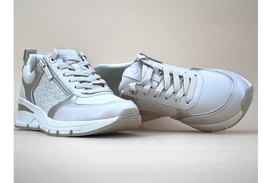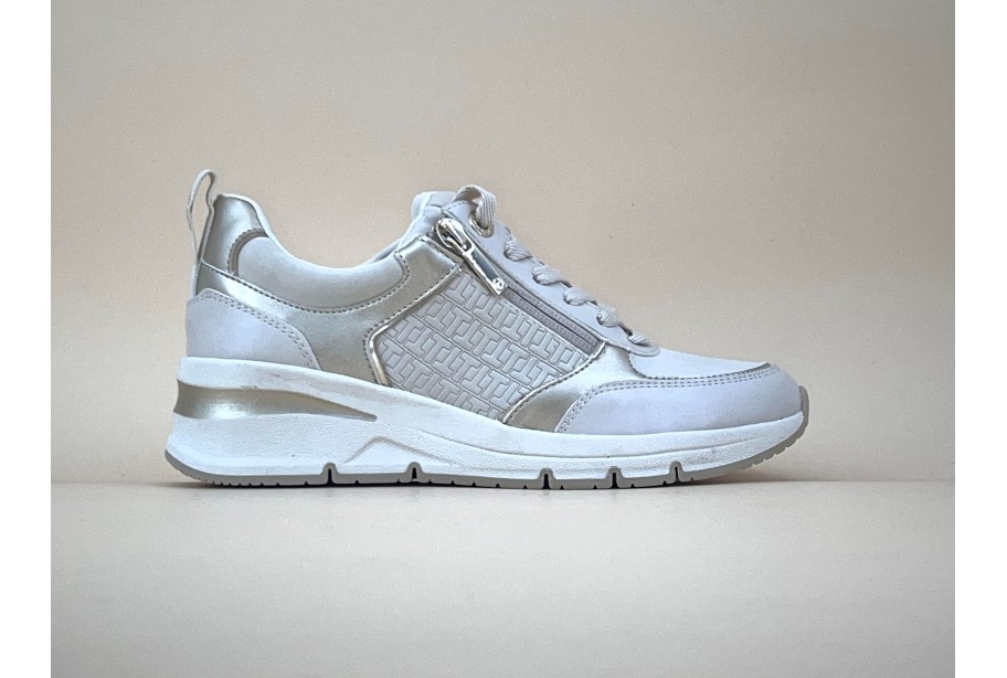 Vous préférez garder une allure féminine dans vos baskets? Ce modèle de TAMARIS vous assurera cette silhouette glamour et tout en confort s’il vous plaît! La palette de couleurs douces et chics est surmontée de détails dorés au niveau de l’oeillet du haut et de la tirette de la fermeture éclair. La semelle intérieure en gel à mémoire de forme est amovible, vous donnant la possibilité de placer des semelles orthopédiques. Le chaussant est normal.
