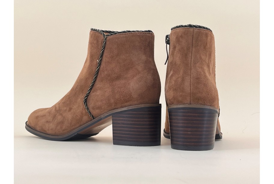 Bottine zippée MAM’ZELLE en velours noisette. Jolis détails de montage: tige légèrement asymétrique pour envelopper la cheville avec harmonie, galon sur le haut et le côté de la tige agrémentée d’une chaine métallique, trépointe soulignée d’une ligne mordorée.