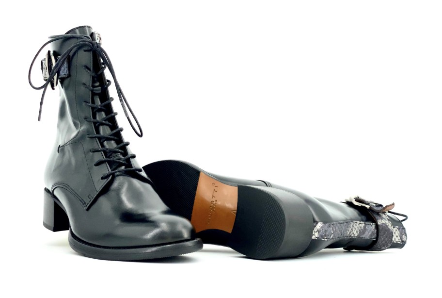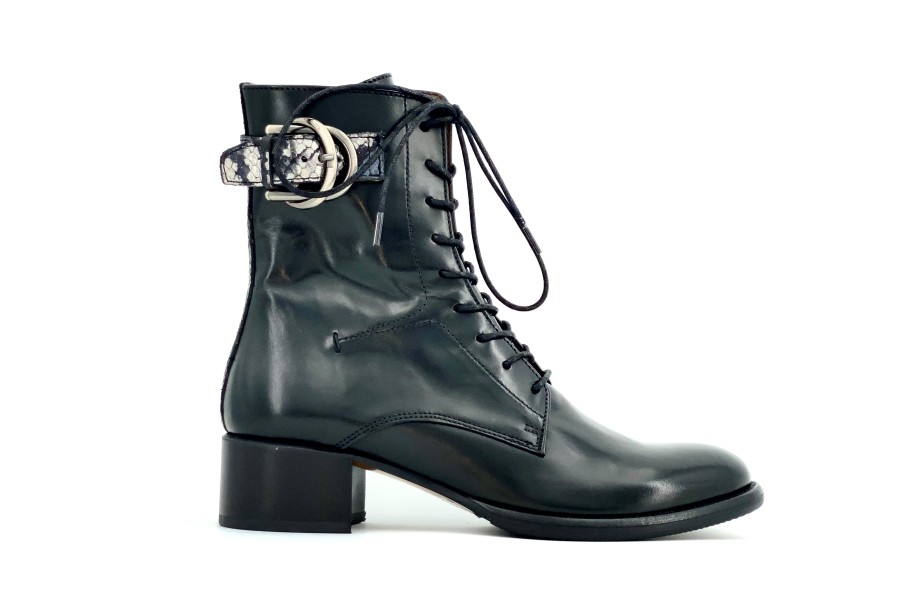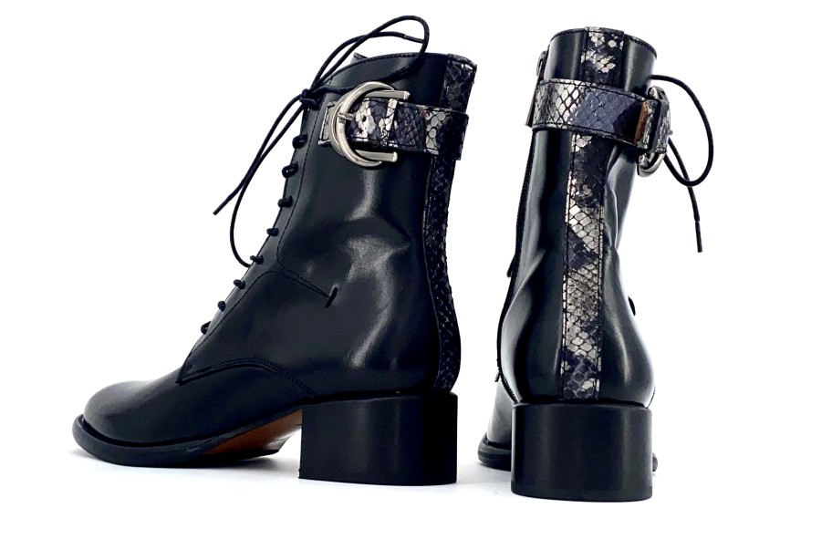 Bottine noire à lacets MURATTI. Chaque saison, la marque nous ravie avec ses jolies collections intemporelles et qualitatives. Double boucle en haut de la tige zippée à l’intérieur. Le cuir cossu est malgré tout d’une grande souplesse. Jolies finitions sur l’arrière et le haut de la tige avec cette bande de cuir acier façon reptile. Chaussant normal. MURATTI, maison française depuis 1985, dessine ses modèles en France et au Portugal, et fabrique uniquement au Portugal afin d’avoir l’assurance de proposer à ses consommatrices des produits d’une grande qualité.