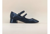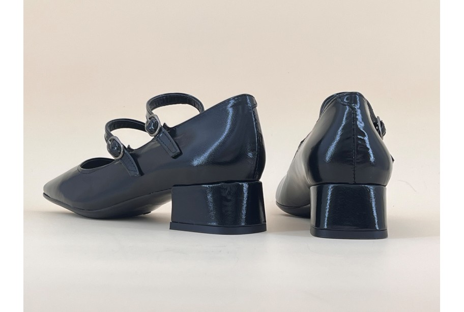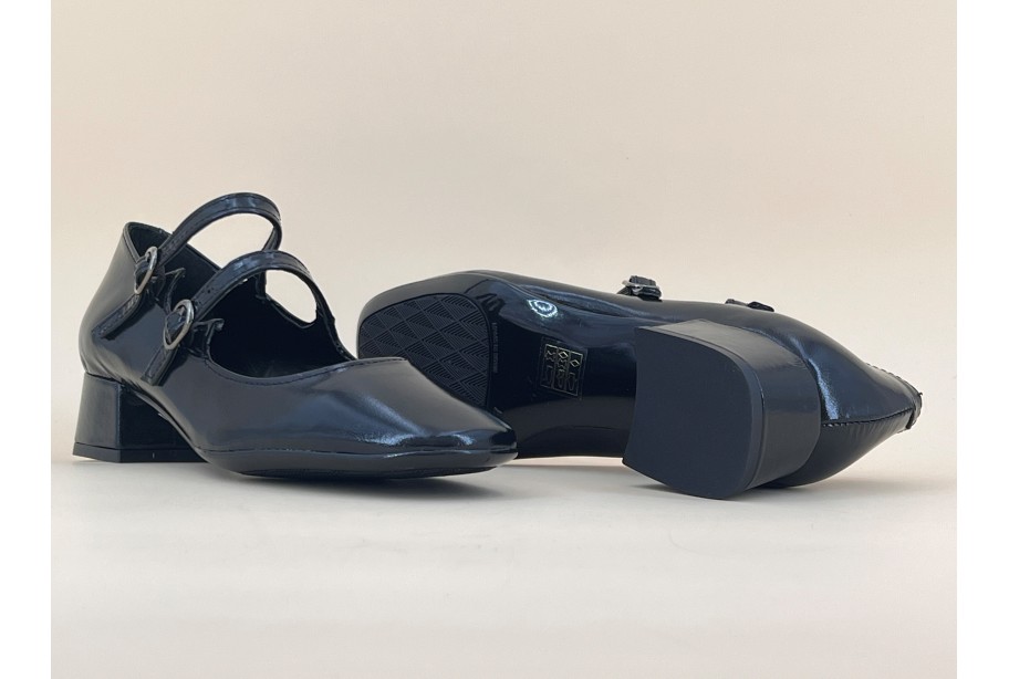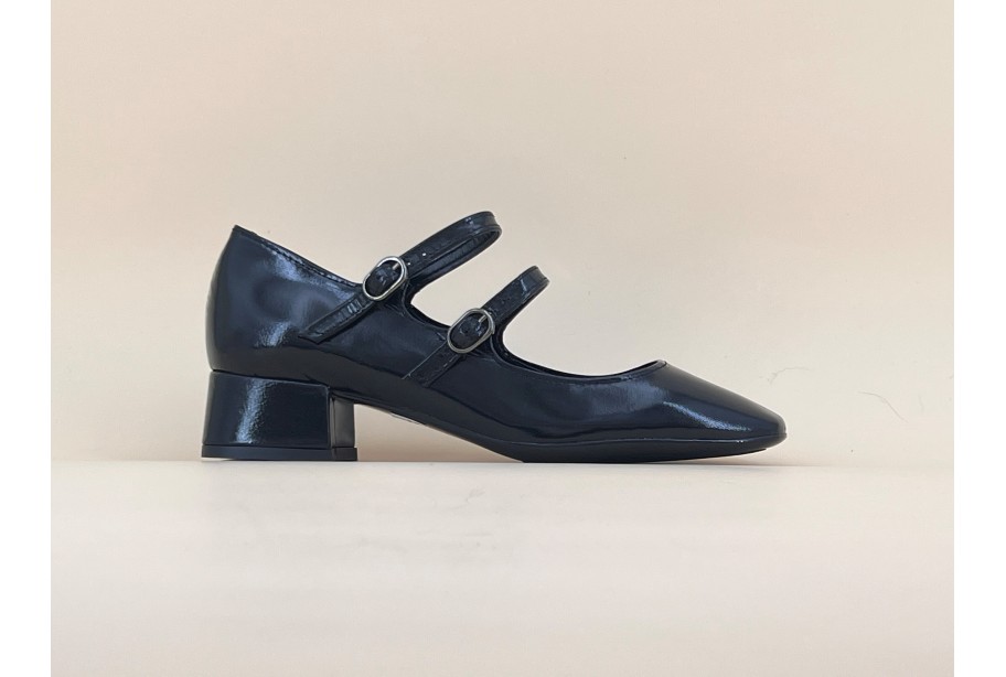 Babies en cuir vernis à double bride. Les brides sont réglables et laissent une aisance sur le pied grâce au montage élastiqué. Bout carré, semelle fine en gomme souple. Existe en vernis noir et vernis rouge.